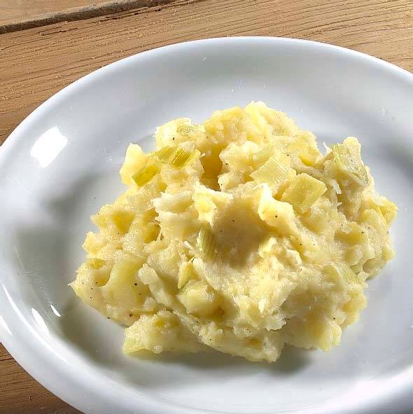 - Stamp de aardappelen fijn. Roer er een scheutje melk door en schep er voorzichtig het appel-seldermengsel door (de appelblokjes mogen niet platgedrukt worden). Breng op smaak met peper, zout en nootmuskaat.