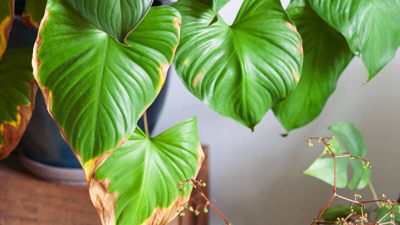 Bladeren die geel of bruin worden, of waarin gaatjes zitten, kunnen erop wijzen dat de plant te bruusk aan te veel (zon)licht werd blootgesteld. Voor de meeste kamerplanten is directe zon in de zomermaanden geen goed idee. In de winter kunnen planten er, net als wij mensen, wel van genieten. Een plek bij een venster op het oosten of het westen is ideaal. Let er ook op dat de planten niet te dicht bij de verwarming en tegen het raam staan om zo verbranding of bevriezing van de bladeren te voorkomen.