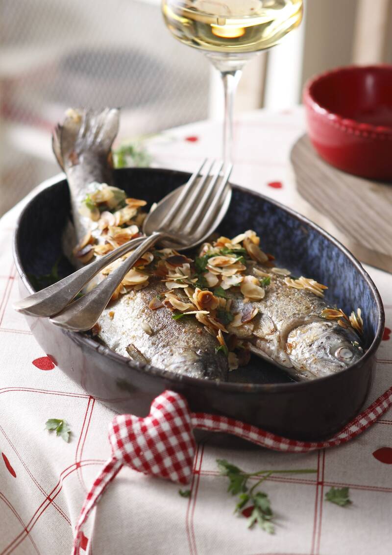 - Bak in de braadpan van de vis de amandelschilfers goudbruin. Lepel de botersaus met amandelschilfers over de vissen.