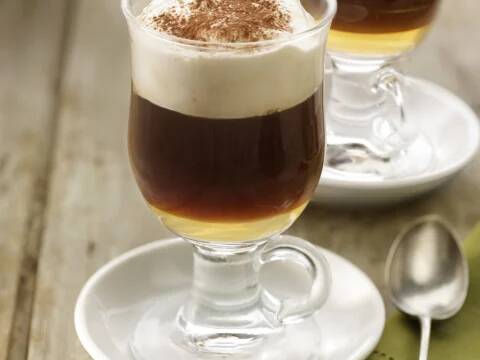 - Schenk de koude, lobbig geklopte room over de rugkant van een lepel bovenop de koffie en serveer.