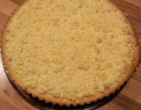 - Bestrooi daarmee de taartvulling en bak 30 min. in een op 200°C voorverwarrmde oven tot de kruimels mooi goudbruin zien.