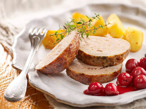 - Serveer het gehaktbroodje in niet te dikke plakken. Zet er de kriekjes in een kommetje apart bij. Lekker warm, met gebakken aardappelen – of koud, bij de boterham!
