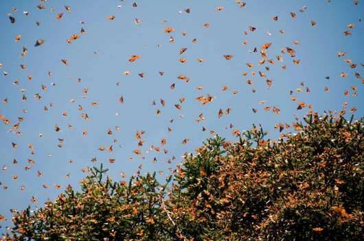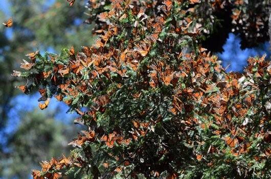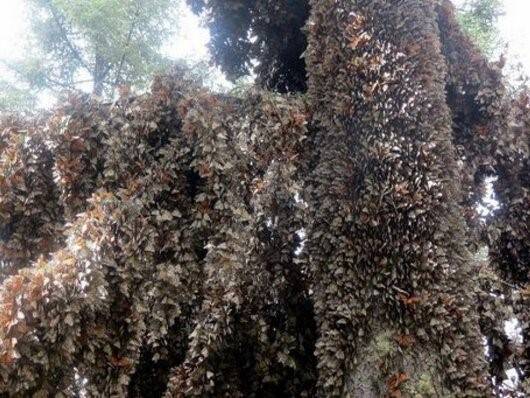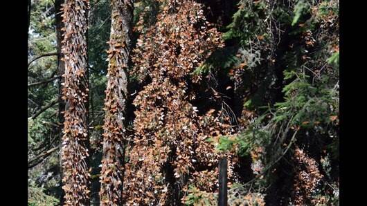 Het pad is steil en met stenen bezaaid. De hoogte beneemt de dagjesmensen de adem. Reken op een klim van bijna twee uur in het koele lommer van het woud. Loofbomen gaan stilaan over in oyamels, zoals de heilige zilversparren hier worden genoemd. Het is de specifieke geur van de sparrennaalden die de vlinders aantrekt. Een enkele vogel verstoort de stilte. Wanneer de gids naar een nóg donkerder geheel van gigantische sparren wijst, weet men eerst niet goed waar je moet kijken. Je zoekt houvast aan het struikgewas en stapt nog dieper het woud in, tot waar de zon niet kan doordringen. Kijk je dan naar de boomkruinen, dan ontdek je massa’s vlinders die in een wirwar van vleugeltjes en lijfjes in trossen samenklitten, wellicht om beter tegen de wind en de koude opgewassen te zijn. De dichte oranjeachtige zwermen halen een diameter van wel 50 cm en hangen zachtjes te wiegen in de bries. Elders zijn de boomstammen bedekt met een dikke mantel vlinders.