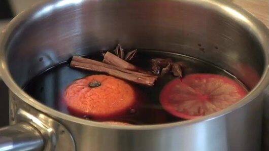 Verwarm een glas rode wijn met 1 koffielepel suiker tot tegen de kook aan. Voeg er een snuifje kaneel bij. Garneer met een schijfje citroen, met daarin kruidnagel geprikt.