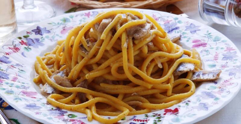 of de ‘bigoli in salsa’ (volkorenspaghetti in een pittige saus). Om deze saus te maken, smoor je heel fijngesneden uien in olijfolie (gedurende 6-7 minuten) tot ze glazig zijn. Hou de ansjovis (of sardines) onder stromend water (om wat te ontzouten). Fileer ze en snij in stukjes. Voeg de vis toe en laat verder smoren, roer kort tot alles klaar is.