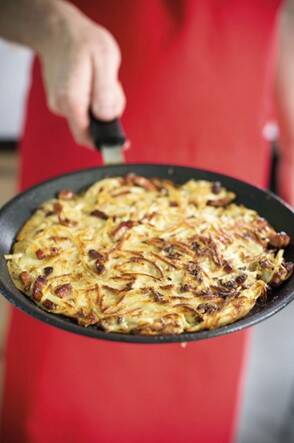 - Bedek de pan met het aardappelmengsel, bak aan 1 zijde goudbruin en gaar op een zacht vuur. Draai de pannenkoek om en laat ook de andere kant op een zacht vuur verder garen.