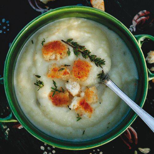 - Serveer de soep met een flinke schep zachte geitenkaas