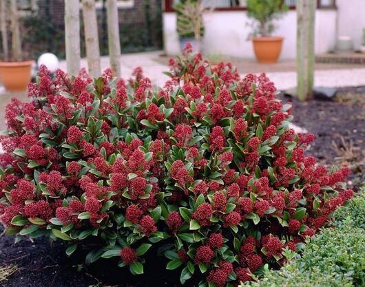 Dit is een wintergroen struikje dat vanaf eind augustus verrast met dichte trossen rozerode bloemknopjes, die pas in maart openbloeien tot witte bloemen. Bij ons, in Nederland en België, zien we vooral de Skimmia japonica Rubella en de Skimmia japonica Reevesiana.