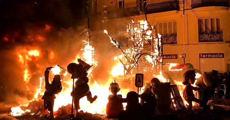 Elk jaar om middernacht – is het net of Valencia in vlammen op gaat. Het is de verbranding van de Fallas. Ze worden elk op beurt aangestoken.