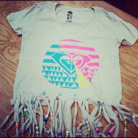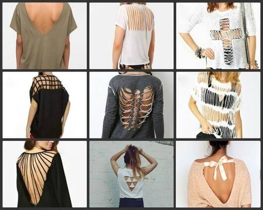 Zelfs een T-shirt kun je een leuke achterkant geven, door er stroken in te knippen. Je knipt bv. stroken in de vorm van een hart en naai daarachter een andere opvallende kleur stof. Je krijgt zo een knallend effect.