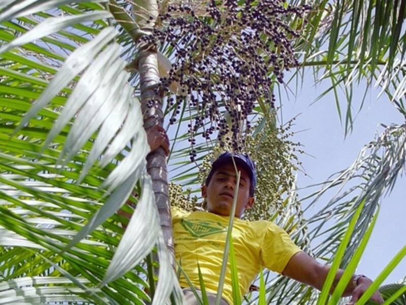 De lokale bevolking kent de jungle en de natuur héél goed. Ze leren er van jongsaf steeds de beste trossen te vinden. En dan beginnen ze, met lenigheid van een panter en een mes tussen de kiezen, te klimmen tot angstaanjagende hoogtes. Daar oogsten ze de loodzware trossen met de hand. De besjes worden onttrost en in typische manden opgeslagen.
