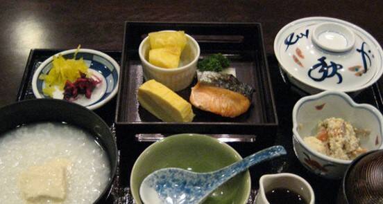 Een traditioneel Japans ontbijt bestaat uit : gekookte rijst met een rauw ei, gestoomde of gestoofde groente en misosoep (vaak met tofu).